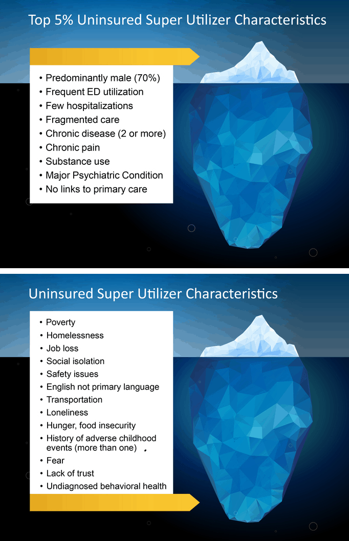 Every person is unique, but there are general characteristics of the top 5 percent of uninsured super utilizers. Seventy percent are male. They frequently use the emergency department but have few hospitalizations. They have two or more chronic diseases and often suffer with chronic pain, typically have major psychiatric conditions such as Schizophrenia or bipolar disorder, are depressed, have no links to primary care and often have fragmented care.